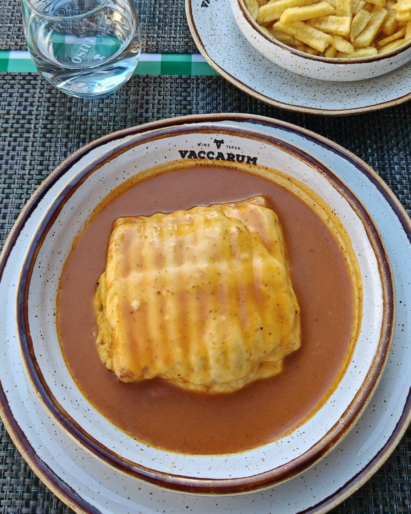 J’ai pu tester la francesinha au restaurant Vaccarum Francesinha. Il s’agit d’un plat très copieux (un peu trop pour moi) , composé de pain, de fromage, de plusieurs viandes (bœuf, jambon, bacon…) le tout dans baigné dans une sauce à base de tomates, bière et piment. Comme si cela ne suffisait pas, ils vous proposent d’accompagner le tout avec des frites, mais honnêtement, vous pouvez vous en passer. Les prix étaient un peu élevés pour Porto avec 15€ pour ce plat et 2,70€ le litre d’eau; mais ça en valait le prix ! Le plat était succulent, les serveurs étaient adorables, ils ont même échangé quelques mots en français avec moi, le cadre est agréable et propre- à l’extérieur, c’est typique avec des tables au motif vichy, et à l’intérieur, c’est cosy chic, à vous de choisir votre préférence. De surcroît, les toilettes sont modernes et très propres, ce qui n’est pas négligeable ! Je vous recommande chaudement cet endroit si vous souhaitez faire une pause après un long effort 😉 ou alors si vous désirez passer un repas en amoureux.