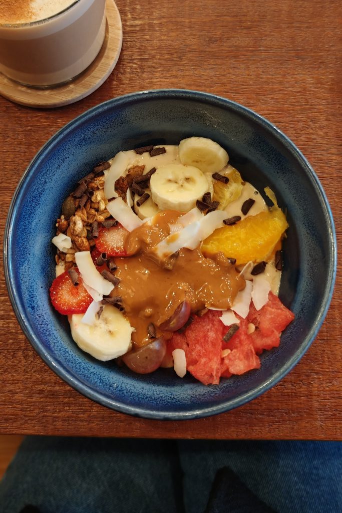 Pour ma première pause chai latte, je me suis arrêtée à CA Downtown, le personnel était très gentil. Dès mon arrivée devant le restaurant, le chef de rang m’a demandé si c’était pour 2- Praline et moi, ça m’a fait sourire et plaisir, puis j’ai eu le choix entre l’intérieur bohème et l’extérieur au soleil. Les serveurs étaient attentionnés, à me demander à plusieurs reprises si c’était bon ou si j’avais besoin de quelque chose, c’était plaisant. J’ai pris un chai latte et un smoothie bowl “Peanut bufler madness”, avec de la banane, du beurre de cacahuète, des fruits frais, du granola fait maison avec des copeaux de chocolat et du yaourt, c’était top. Le chai latte n’était pas très assez sucré à mon goût mais néanmoins bon, nettement moins qu’au Starbucks pour ceux qui souhaitent un référentiel ^^ Incroyable, sans le faire exprès, je me suis installée à la table 6, mon chiffre porte-bonheur. Bref, c’était un bon moment.