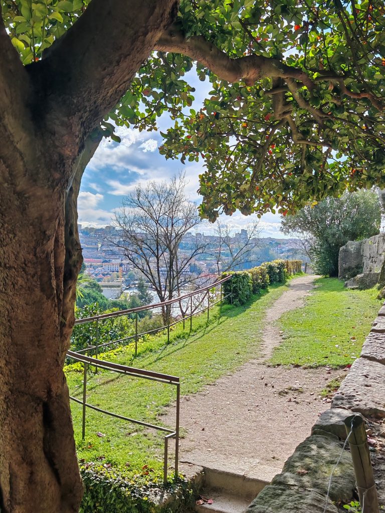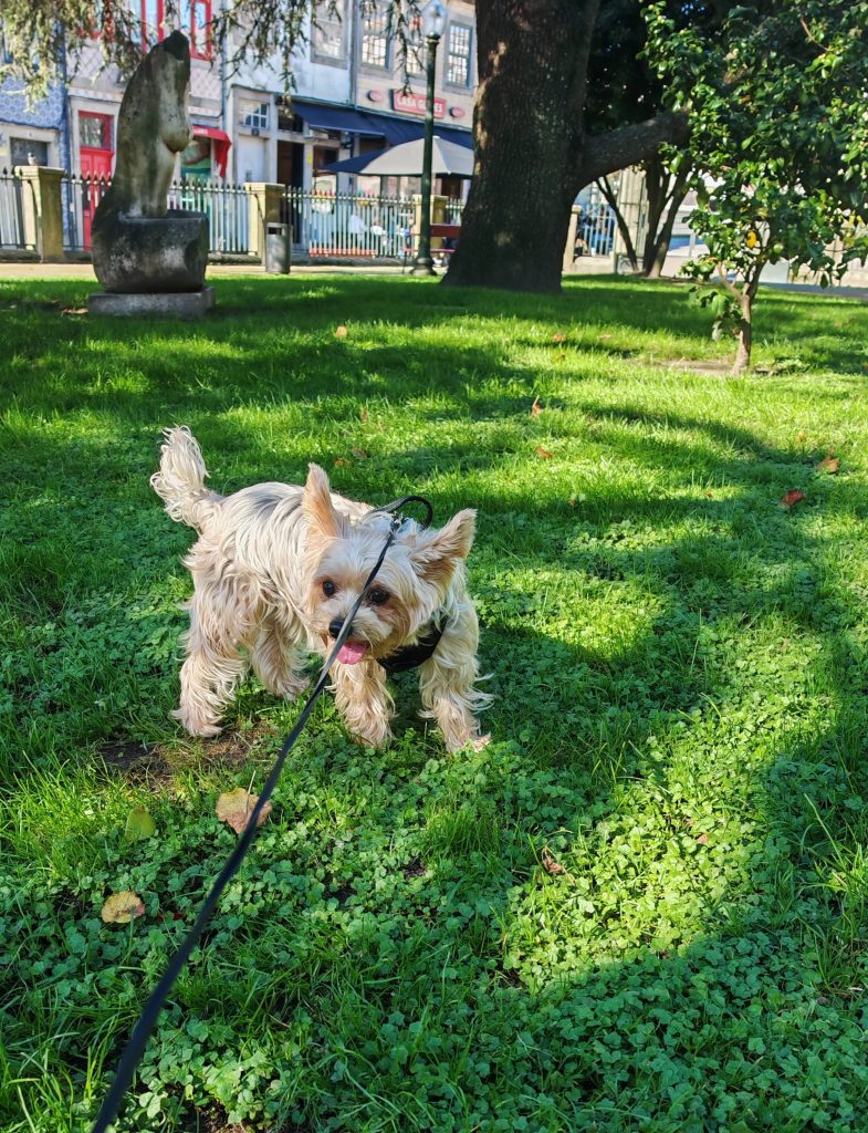 En continuant de descendre, nous avons rejoint le petit Jardim Marques de Oliveira; Pralinette était ravie, elle a pu courir en laisse dans l’herbe, tel un petit Pokémon sauvage. Ce chemin nous a menées à Las Fontainhas, où j’ai été époustouflée par la vue imprenable sur la ville :